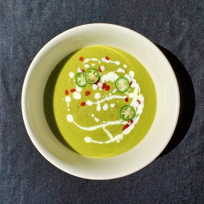 Poblano and corn soup with lime crema; citing Brandi Key and Jorge Valencia of LMN Hospitality
